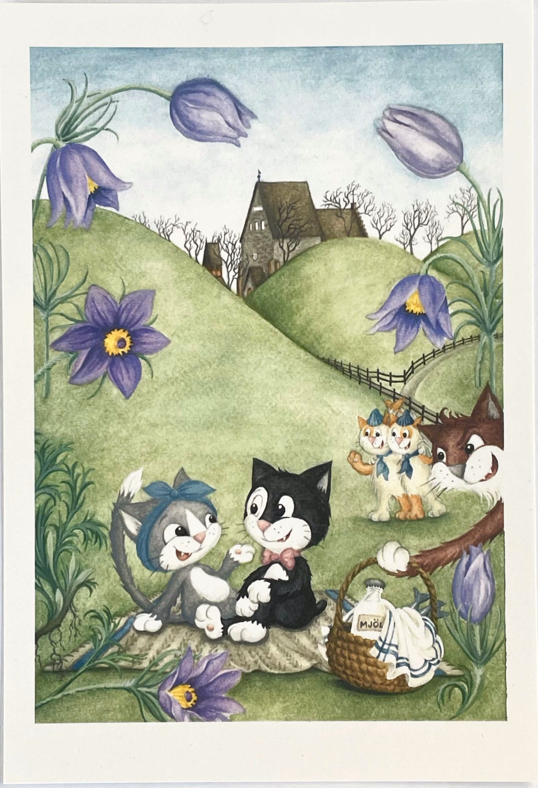 Nytt vykort – Pelle Svanslös och Maja Gräddnos har picknick vid Gamla Uppsala högar. Måns, Bill och Bull kommer objudna såklart! Backsippor och Gamla Uppsala kyrka finns också med.